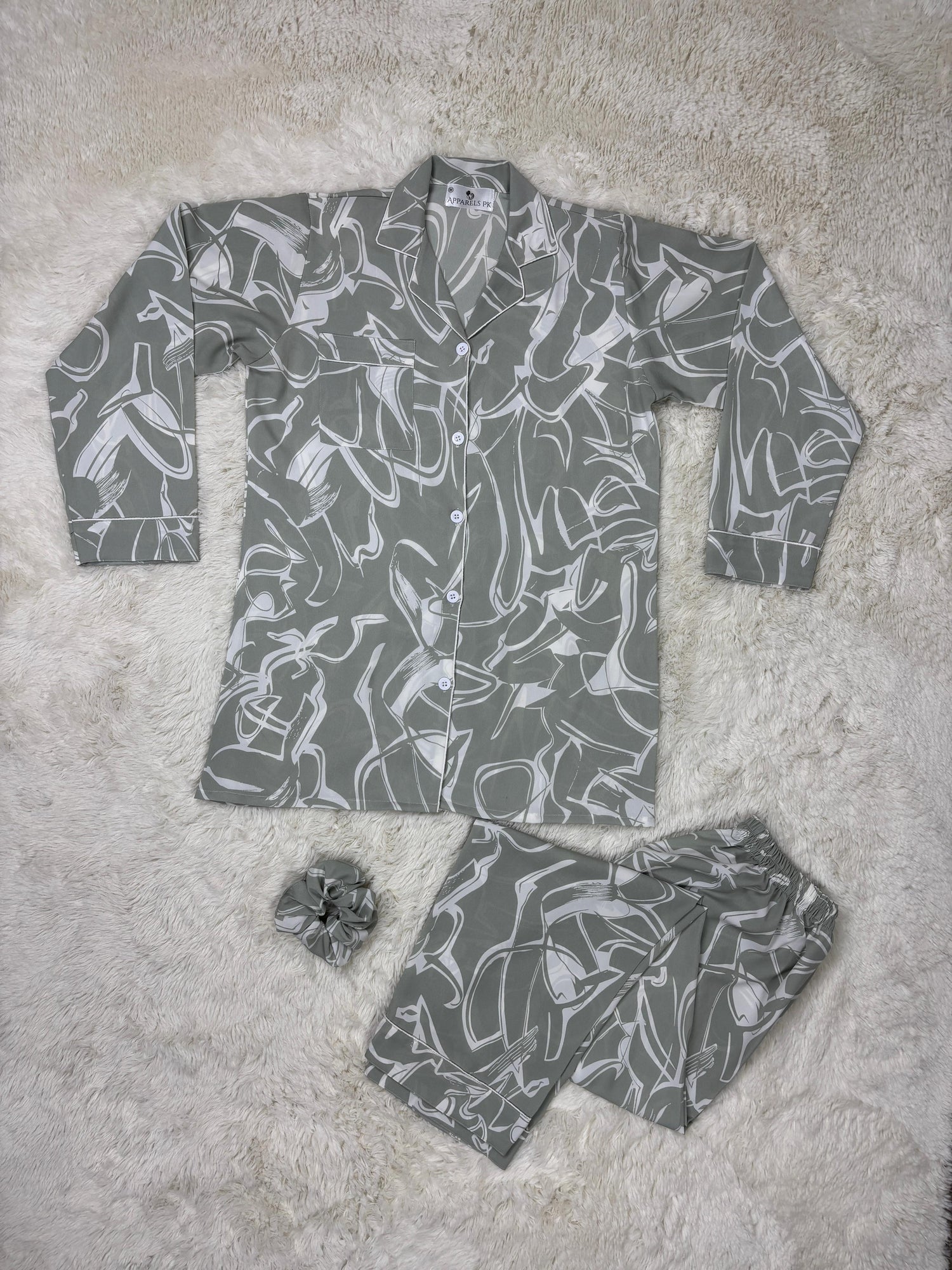 Embrace modern style and comfort with this gray pajama set, featuring an abstract white pattern for a sleek, contemporary look. Made from soft, breathable fabric, it includes a matching scrunchie for a perfectly coordinated and cozy nightwear ensemble