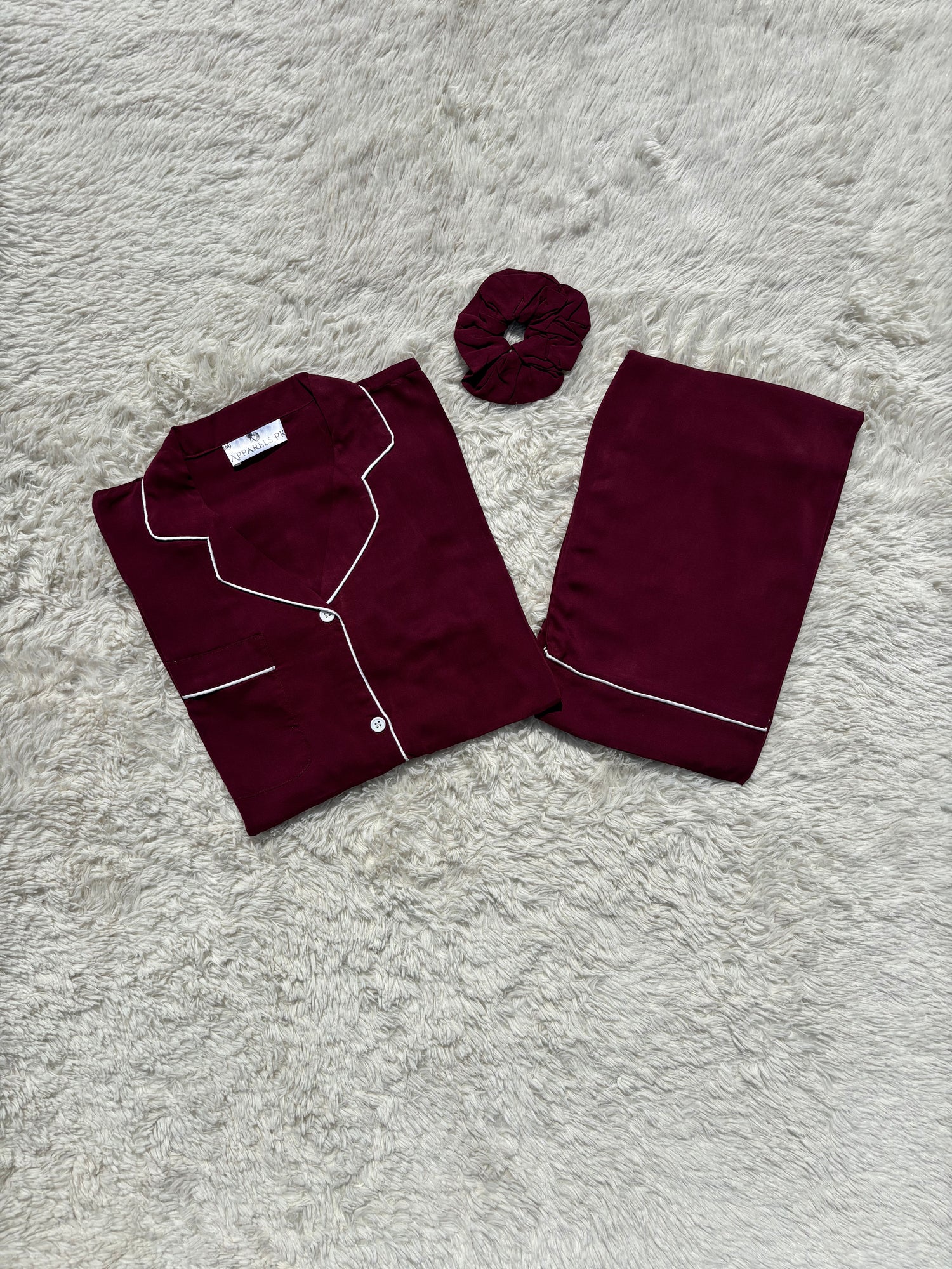 Embrace modern style and comfort with this gray pajama set, featuring an abstract white pattern for a sleek, contemporary look. Made from soft, breathable fabric, it includes a matching scrunchie for a perfectly coordinated and cozy nightwear ensemble