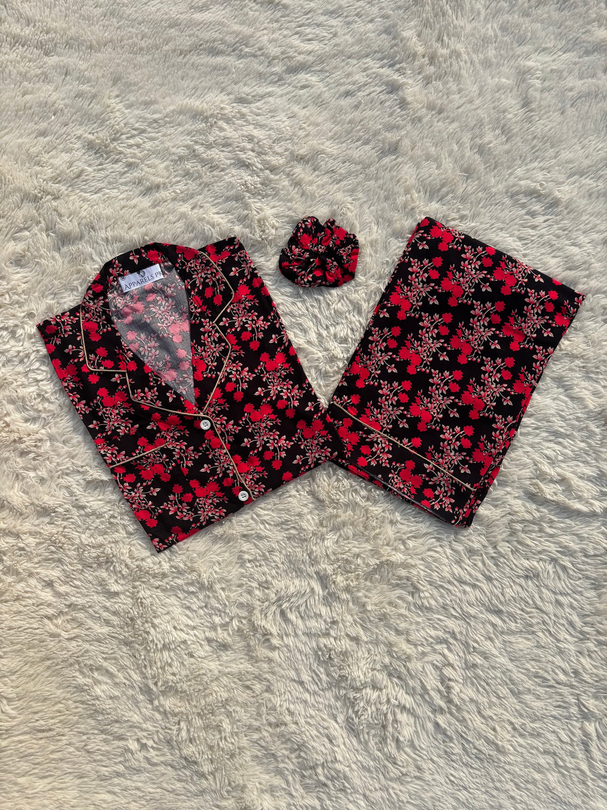 Experience a touch of romantic elegance. This set features a rich, classic floral print in a beautiful blend of red and black, creating an elevated look that feels both timeless and luxurious.
