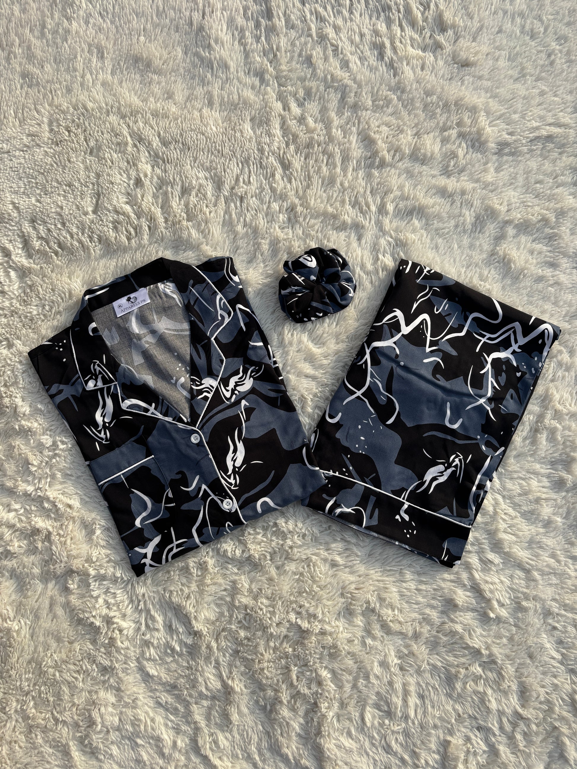 Whether you're lounging at home or settling in for a restful sleep, the Noir Abstract PJ set brings together comfort, sophistication, and artistic flair.