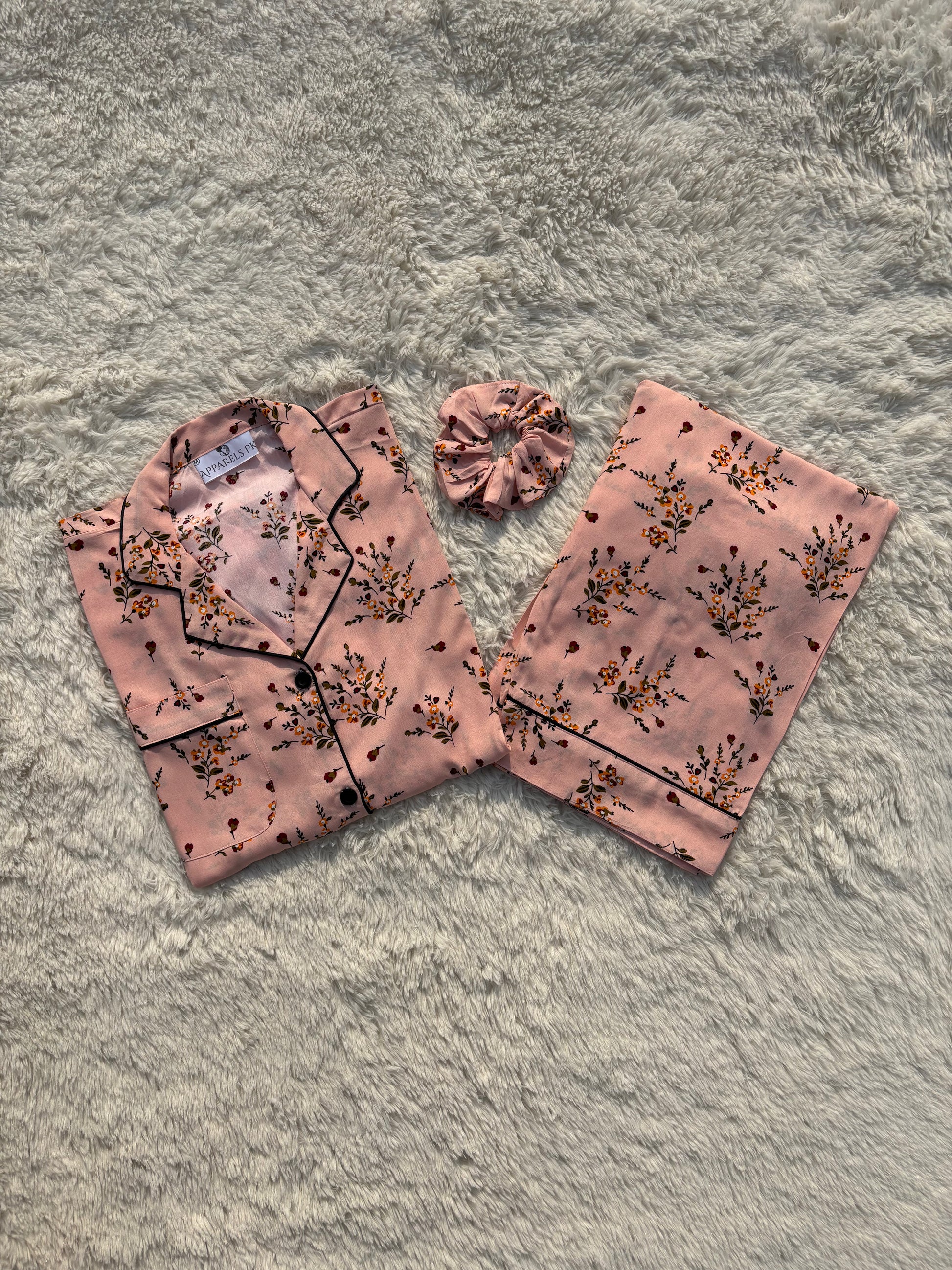 Drift into dreamland with The Petal Luxe Set. This exquisite 2-piece pajama is made from premium organic linen, featuring a delicate dusty rose print, sophisticated black contrast piping, and a matching scrunchie. It offers unmatched breathability and a beautiful, gentle touch for a luxurious night's sleep.