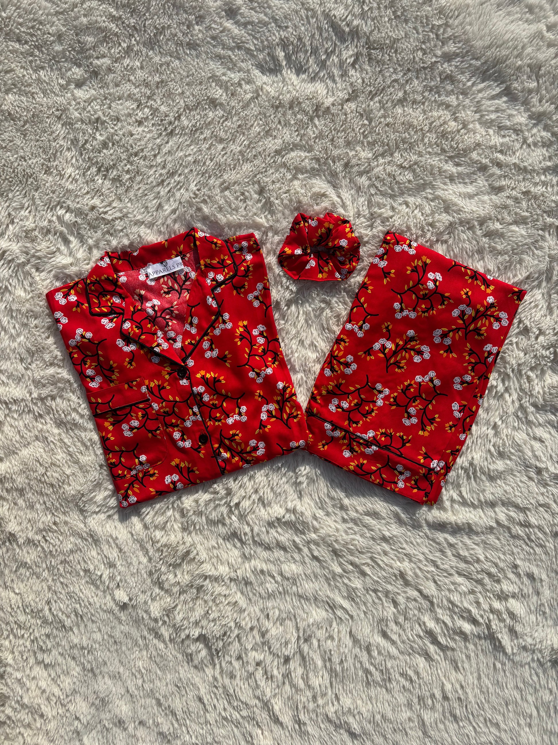 Experience luxury in The Valencia Set, an exquisite 2-piece pajama crafted from premium organic linen. This vibrant red floral ensemble features sophisticated contrast piping and includes a matching scrunchie for a truly stylish, restful night's sleep.